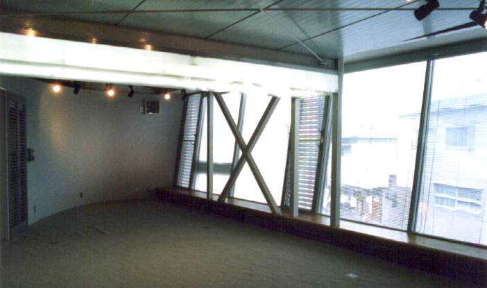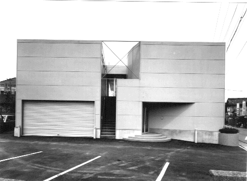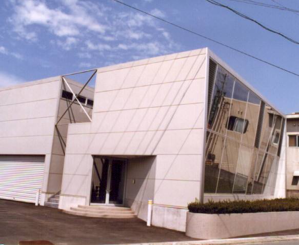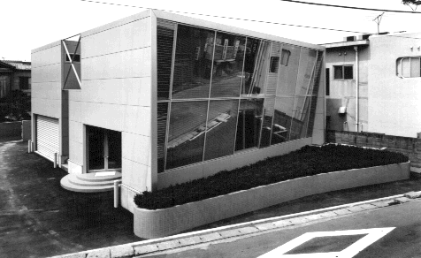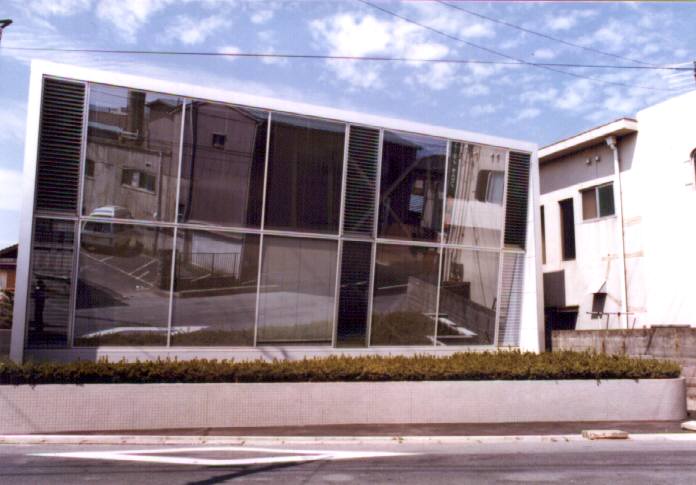 外観 傾斜したハ−フミラ−ガラスはダブルレイヤになっていて夏の直射日光を全反射するパッシブシステムです。